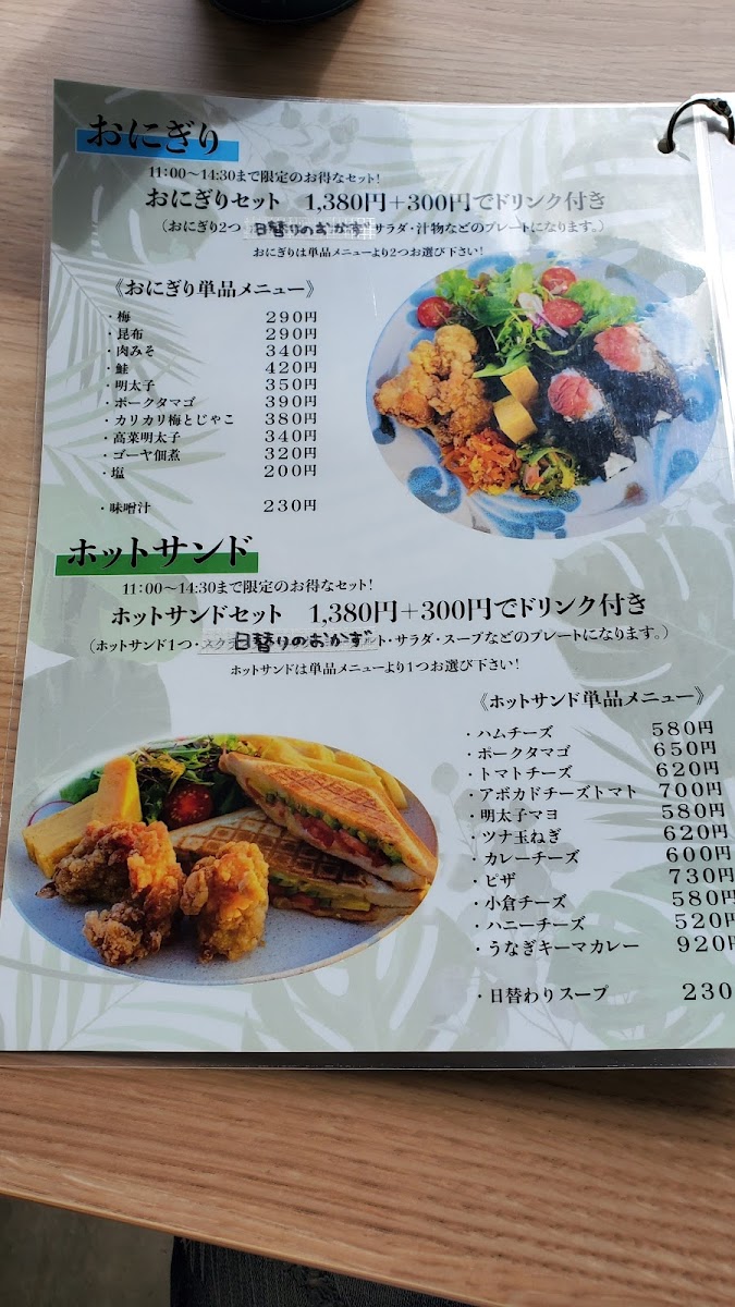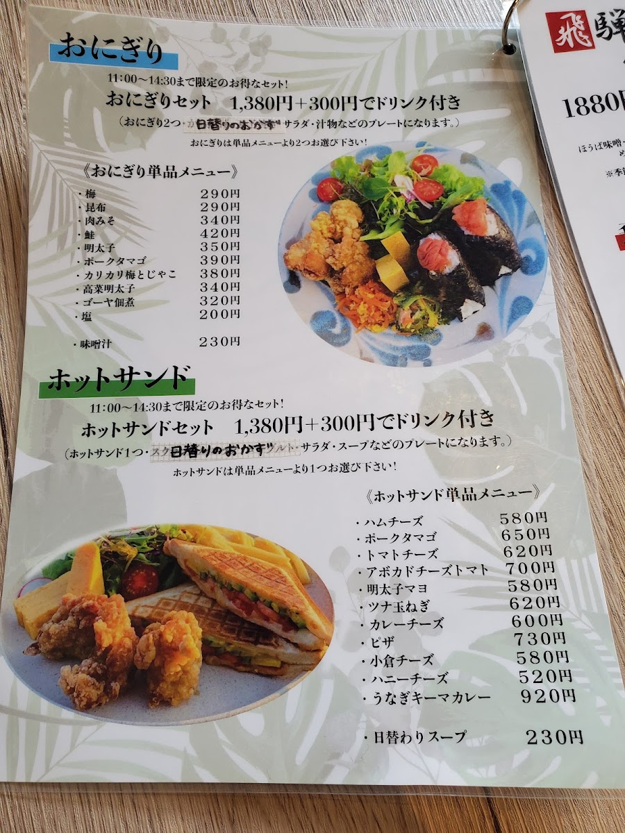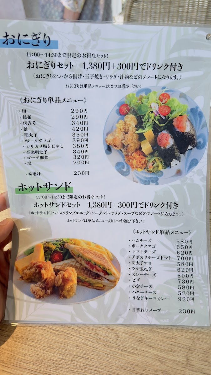 This menu offers a variety of cafe-style food and drinks suitable for breakfast, coffee breaks, and light meals. It features a selection of plated dishes centered around rice balls (おにぎり), including the option to choose two fluffy rice balls served on a single plate. Additional options include hot sandwiches served warm on one plate and unique items such as pickled steak.